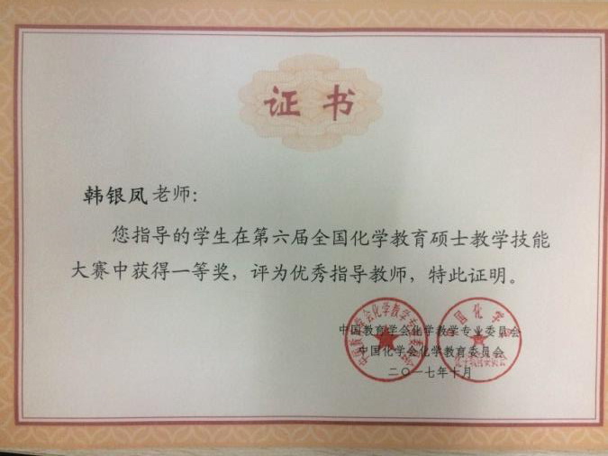 在2017年“第六届全国化学教育硕士教学技能大赛”说课比赛中,由开元赵立芳教授、韩银凤副教授指导的教育硕士李秦怡获得特等奖,赵立芳、韩银凤被评为优秀指导教师。