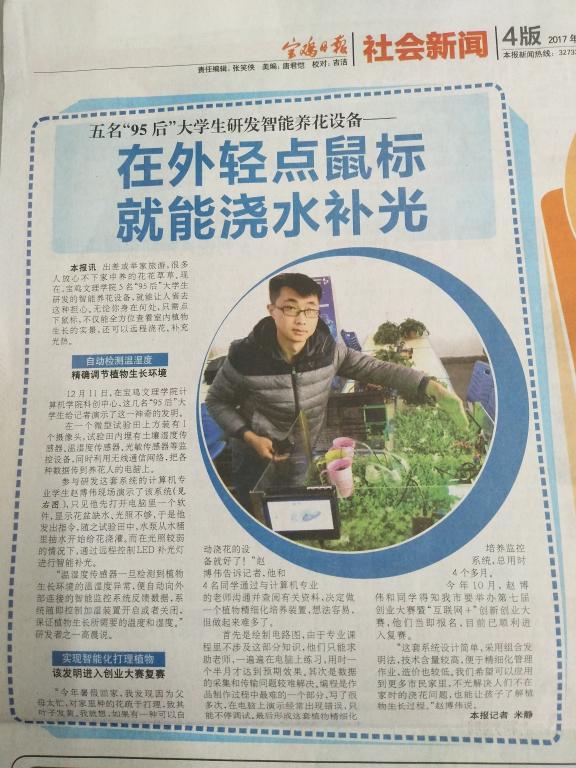 针对当前的“老人生活”“家庭绿色种植”“智能管家”等一系列广大听众所关注的生活理念问题,指导教师张平,科创中心学生核心成员赵博伟、杨磊、高晨、袁梦华等同学分别向采访组展示了他们研发的作品与科技发明。这些作品和发明集中体现了绿色生活、智能管理的理念,得到了采访组的一致好评与认可。宝鸡日报12月13日4版以《五名“95后”大学生研发智能养花设备——在外轻点鼠标就能浇水补光》为题,报道了计算机学院大学生科技创新工作的成果与先进事迹。