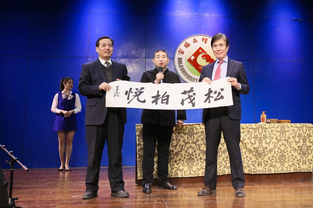 比赛分为参赛演讲、文艺表演、现场互动问答三个环节。选手们声情并茂、语言流利、思维敏捷,在舞台上淋漓尽致地挥洒才情,他们的出色表现赢得了评委和现场观众的阵阵掌声。同时,大学生艺术团为本次比赛呈现了精彩的艺术体操、舞蹈表演,并与美术学院教师魏育龙一起合作表演了音书画《茉莉花开》,魏育龙现场题词“松茂柏悦”,杨子元代表学校将这幅题字赠送给韩锡政校长。本次比赛评审委员长白鹤动对选手的表现作了精彩点评。