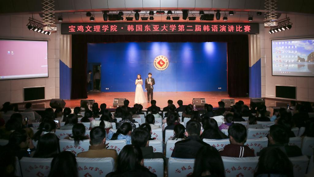 座谈会后,两校联合举办的“第二届韩语演讲比赛”在新校区音乐厅举行。副校长杨子元和东亚大学校长韩锡政、国际交流处处长文哲珠等观看了演讲比赛。
