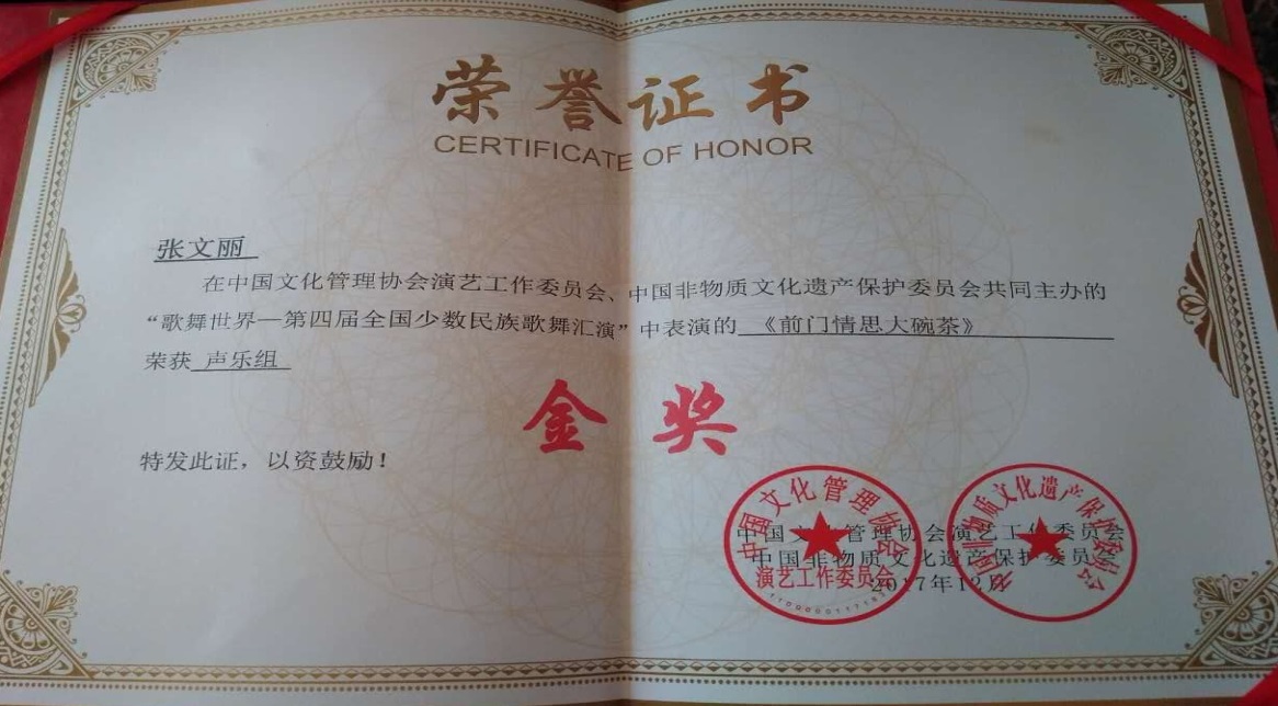 近日,开元音乐学院教师张文丽在“歌舞世界——第四届全国少数民族歌舞汇演”总决赛中以一首《前门情思大碗茶》荣获声乐组金奖,并受邀参加了《孝道行天下》精品节目展演录制。