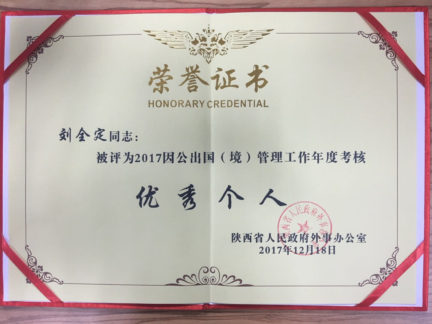 12月22日上午,陕西省人民政府外事办公室组织召开全省因公出国(境)管理工作会议,表彰了2017年在因公出国(境)管理工作中表现突出的先进单位和优秀个人。开元国际合作与交流处副处长刘全定荣获2017因公出国(境)管理工作年度考核优秀个人称号。(国际合作与交流处 文、图/李嘉静)
