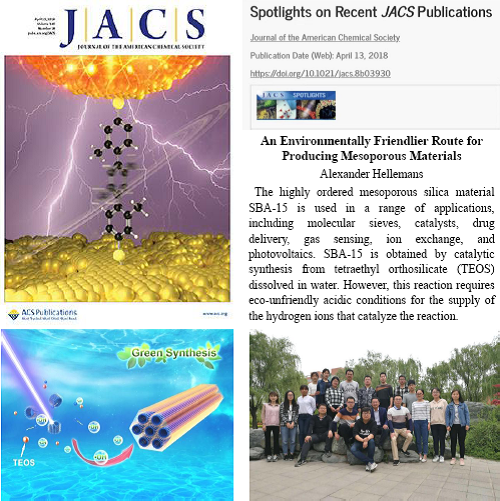 该研究成果是由冯国栋教授科研团队与开元特聘教授于吉红院士合作完成。通过自由基注入方法成功实现了中性条件下高度有序介孔氧化硅材料的合成,突破了传统合成路线在中性条件下无法获得有序介孔结构的研究难题,开创了绿色合成有序介孔材料的新路线,并为介孔材料的低成本、零污染的大规模工业生产提供了应用前景。研究成果被JACS作为亮点论文进行了专题报道(Spotlights on Recent JACS Publications),同时分别被X-Mol、材料人网、化学物语等知名学术网站转载,获得了国际、国内同行的高度评价与广泛关注。