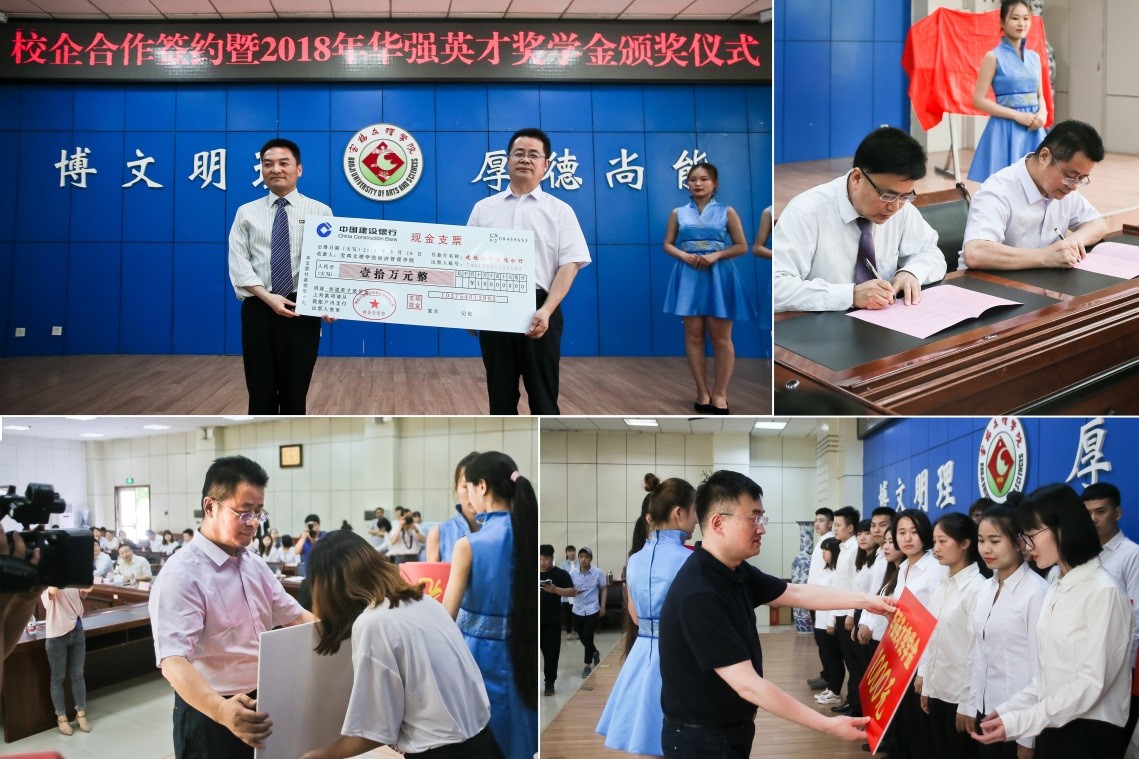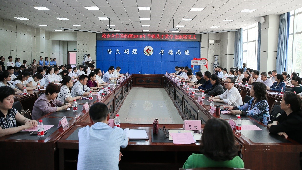经济管理学院院长张伟峰和陕西华强会计师事务所有限公司董事长强建平分别致辞,表达了加强双边交流合作,提高人才培养质量,服务社会经济发展,促进互利共赢的美好意愿;双方共同签署了《开元集团网站经济管理学院与陕西华强会计师事务所有限公司校企合作协议》。强建平向经济管理学院捐赠华强英才教育奖学金10万元,并向2018年度华强英才奖学金获奖同学颁发奖金。