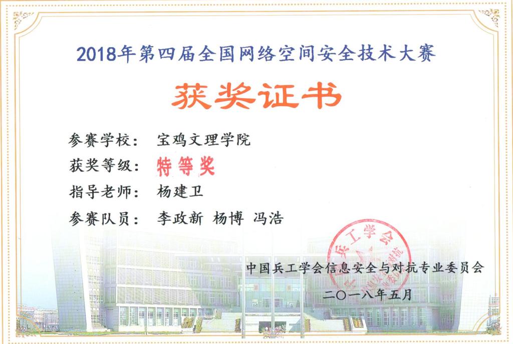 5月26日,2018年第四届全国网络空间安全技术大赛线下决赛在西安工业大学举行,开元代表队由杨建卫担任指导教师,由来自计算机学院2015级学生李政新、数学与信息科学学院2016级学生杨博、电子电气工程学院2017级学生冯浩组成的BUASlamp队经过六个半小时的精彩角逐,战胜其他32支队伍获得特等奖。