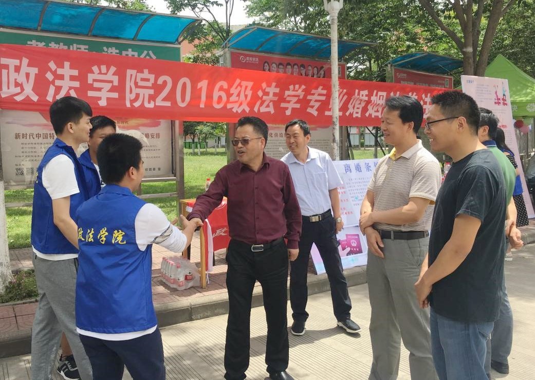 6月4日,政法学院法律诊所联合2016级法学专业在新校区开展了以《婚姻法》为主题的校内普法宣传和咨询活动。校党委副书记栾宏在学工部部长冯森、团委书记党建波、政法学院党总支书记于建伟、副书记王宏江陪同下参观了活动。