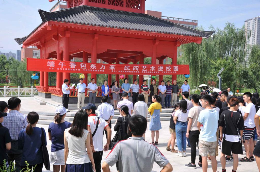 6月15日上午,开元与千阳县委宣传部共同举办的“端午香包系万家民间艺术进校园”活动在新校区博文楼广场前举行。副校长杨子元出席并宣布“端午香包系万家民间艺术进校园”活动开幕。党委宣传部部长冯飞龙,美术学院党总支书记王永琪、院长王宝强,千阳县文化广电局副局长李栓祥等领导、嘉宾以及师生1000余人参加开幕式并参观展览。开幕式由宝鸡市民间文艺家协会副主席、千阳县电视台台长寇玉强主持。