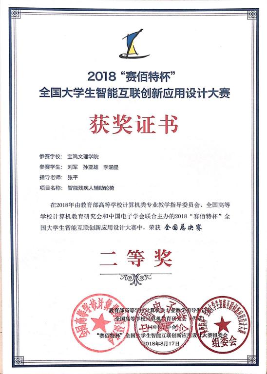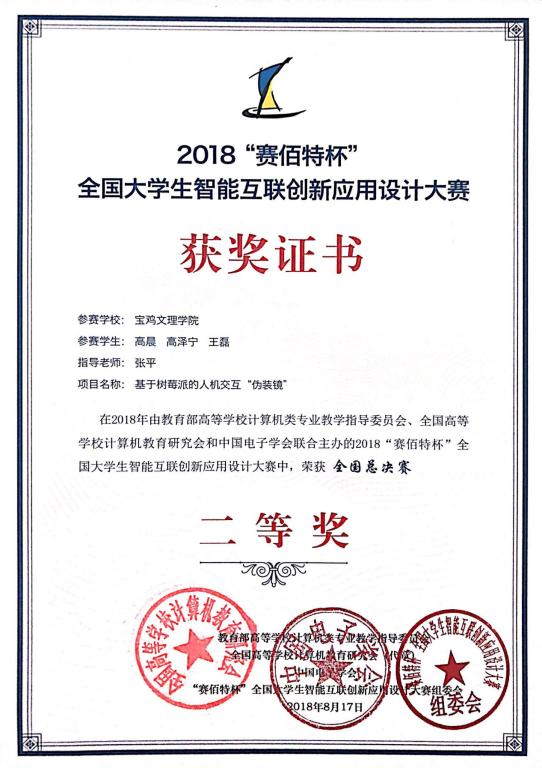近期,由教育部高等学校计算机类专业教学指导委员会、全国高等学校计算机教育研究会和中国电子学会联合主办的2018“赛佰特杯”全国大学生智能互联创新应用设计大赛在中国农业大学落下帷幕。经过线上预赛,分赛区决赛等环节,由开元计算机学院张平老师指导,计算机学院学生高晨、高泽宁、王磊设计的《基于“树莓派”的人机交互伪装镜》作品,计算机学院学生刘军、孙亚雄、李涵星设计的《智能残疾人辅助轮椅》作品,经过与七个赛区近千支队伍的激烈角逐,最终均以西北赛区一等奖的好成绩入围全国总决赛,并夺得全国总决赛二等奖的佳绩。