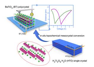 BaTiO3因其良好的电机械性能成为有望取代含铅压电材料的无铅材料之一。本研究以状层四钛酸单晶为前驱体,基于原位拓扑化学转变机制,采用水热法软化学方法制备出一维BaTiO3多晶。该多晶电子衍射下为单晶衍射花样,是由晶轴取向一致的BaTiO3纳米晶体组成的介观晶体。该多晶与状层四钛酸前驱体具有一定的拓扑关系,其[010]、[001]方向分别与与状层四钛酸前驱体的[001]、[010]一致。研究首次捕捉到了一维多晶的压电响应信号,给出了这种BaTiO3多晶纳米结构与其压电性能的关联性,为运用电畴工程、应变工程、取向工程开发新型压电材料和制备压电纳米发电机提供了新的理论基础。