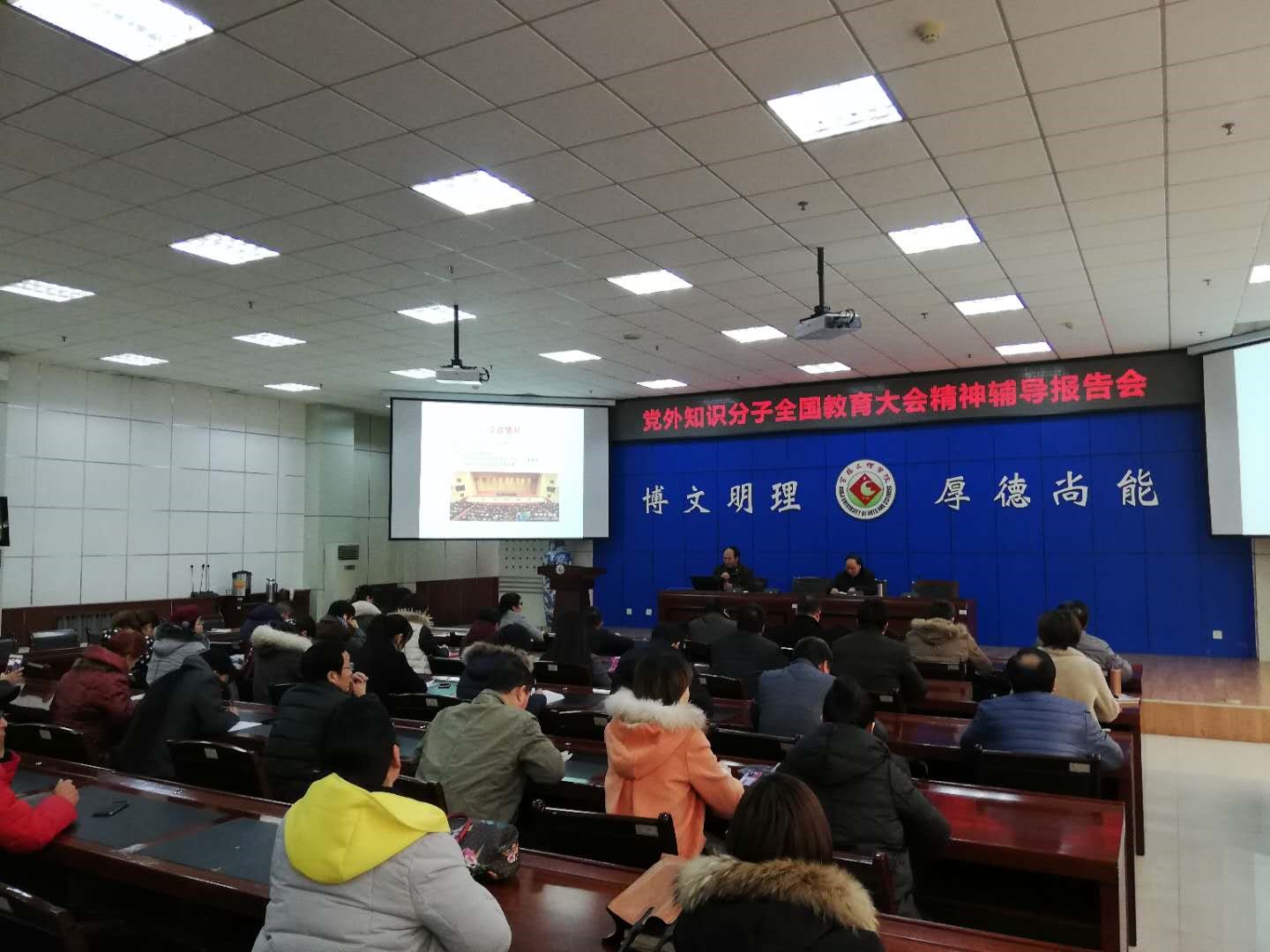 民盟、民进、民建、九三学社、民革成员,无党派人士代表50余人参加了报告会。(党委统战部 文/王红梅 图/王彩旭)