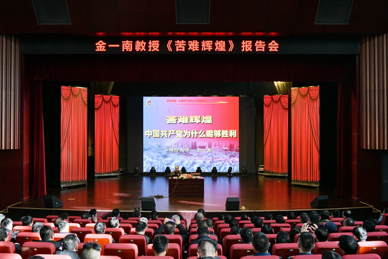 报告会上,金一南教授运用珍贵的 史料和生动的例证,阐释了中华民族近百年来经历苦难和挫折,从挫折走向胜利,从苦难走向辉煌的艰辛历程。他以中华民族的百年救亡、百年复兴为主线,用生动的语言、精彩的故事、丰富的史料和鲜为人知的历史细节,讲解了中国共产党为什么能够存在并且成为中国的执政党,我们究竟应该坚持一种怎样的信仰等问题。整场报告信息量大、史料鲜活、语言生动、激情澎湃、感染力强,有思想深度、有战略高度、有时代温度、有知识厚度,对于我们全面学习了解党的历史、提升党性修养,具有很好的指导意义。