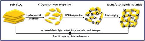 构建高能量密度超级电容器器件一直是储能领域的研究热点,而高容量电极材料的理性设计是解决这一问题的关键。五氧化二钒(V2O5)作为赝电容器电极材料,受到研究者的广泛关注。但由于V2O5块体材料活性低、导电性差且充放电过程中容量损失严重,进而限制了其在赝电容器中的应用。针对这一问题,本研究以纳米结构可以提高电极与电解质之间的有效接触面积、提升电极比容量及缩短离子迁移路径为指导思想,首先通过水热法制备了高分散性V2O5纳米片层分散液。由于制备的高活性V2O5纳米片层容易堆叠重组,因此向体系中引入大比表面积高电导率介孔碳空心球(MCHS),通过冷冻干燥技术制备了三维分级多孔结构MCHS/V2O5纳米杂化材料,这不仅可以阻止V2O5纳米片层的团聚,而且可以有效提高其电导率。与纯V2O5和MCHS相比较,制备的MCHS/V2O5纳米杂化材料发挥了各组分之间的协同效应,显示了高的质量比容量、倍率性能及循环稳定性,该研究成果对于高性能超级电容器电极材料的理性设计具有指导意义。(科技处、化学化工学院 文/田梅娟)