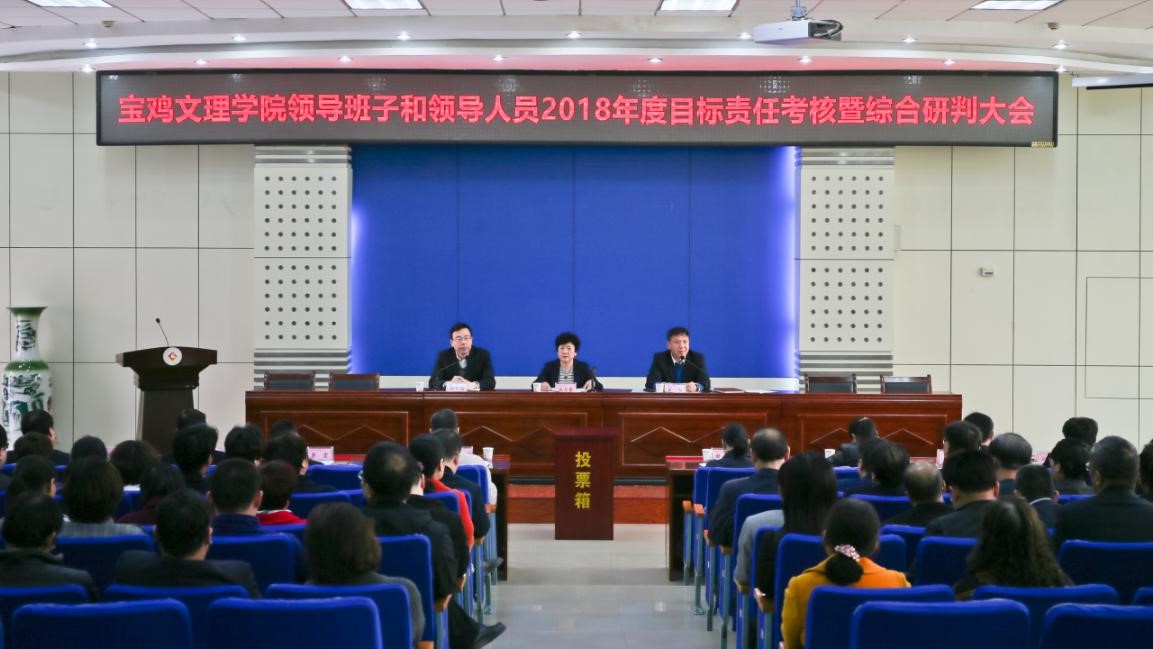 会上,白黎代表学校领导班子作了2018年度领导班子目标责任考核工作报告,报告从思想政治工作、组织领导能力、组织体系建设、党风廉政建设四个方面全面总结了学校2018年的工作。报告指出,2018年学院领导班子在省委、省政府和省委教育工委、省教育厅的领导下,坚持以习近平新时代中国特色社会主义思想为指导,深入学习贯彻党的十九大精神和全国、全省教育大会精神,坚持社会主义办学方向,落实立德树人根本任务,围绕建设高水平宝鸡大学奋斗目标,全面深化改革,加快内涵发展,推进“四个一流”建设,奋力追赶超越,圆满完成了全年目标任务。他强调,2019年是深入贯彻落实全国、全省教育大会精神的重要一年,学院领导班子将团结带领广大师生员工,奋发进取、担当作为、狠抓落实,写好创建高水平大学“奋进之笔”,以优异成绩迎接新中国成立70周年!
