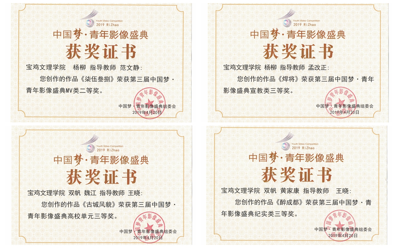 4月20日,第三届“中国梦·青年影像盛典”在山东省日照市拉开帷幕,开元文学与新闻传播学院广播电视编导专业教师王晓带领学生杨柳、双帆、魏江参加此次盛典。在此次大赛中,开元数字媒体团队、广播电视编导专业选送的4部作品获奖,其中《柒伍叁捌》获MV类二等奖,《焊将》获宣教类三等奖,《古城风貌》获短片类三等奖,《醉成都》获纪实类三等奖。