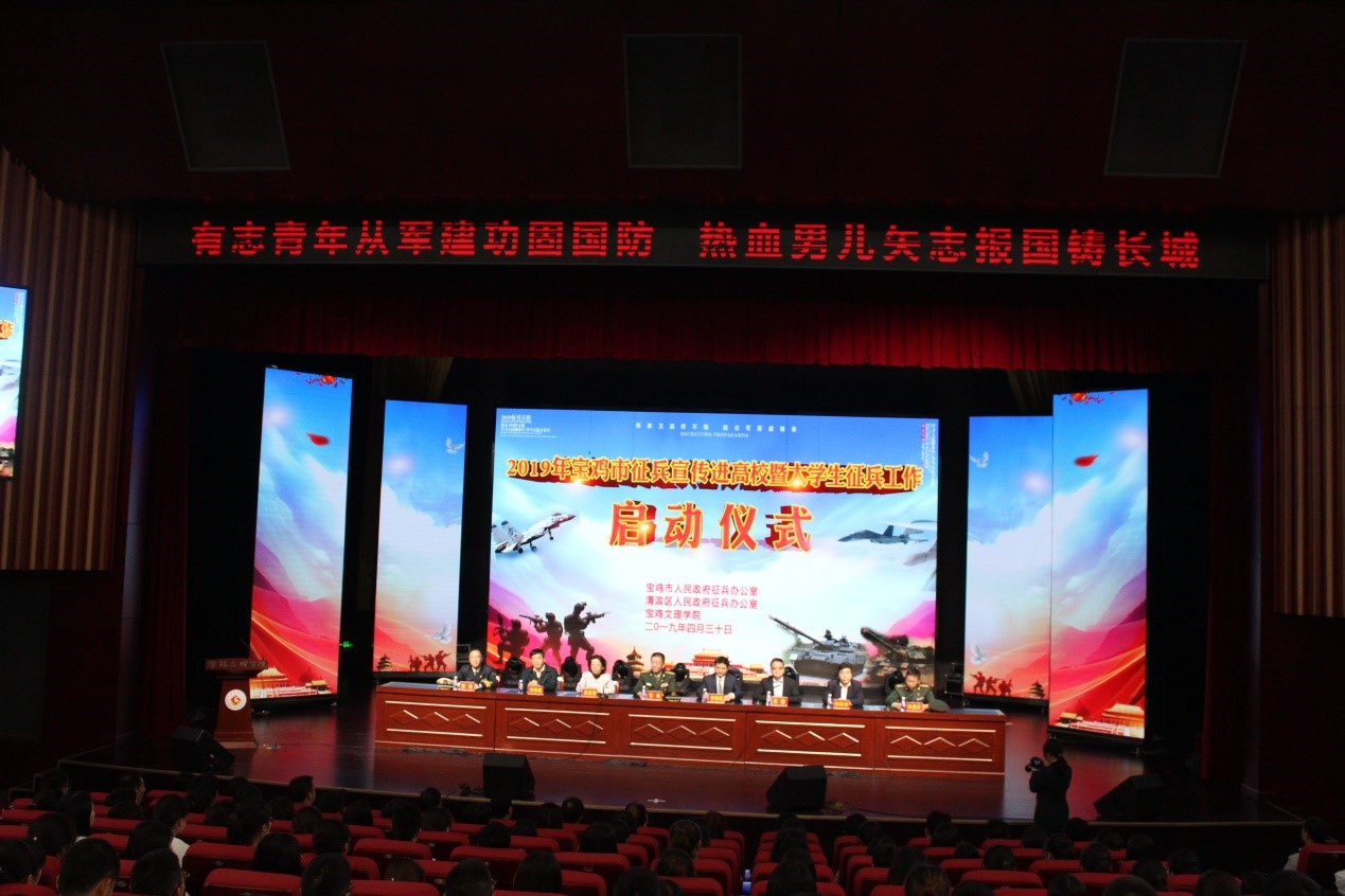 4月30日上午,2019年度宝鸡市大学生征兵宣传暨征兵工作启动仪式在开元博文楼报告厅举行,宝鸡市委常委、副市长曾德超,宝鸡市军分区司令员张炜及渭滨区有关领导参加启动仪式。校党委副书记栾宏出席仪式并讲话。