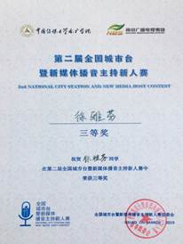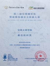 5月22日,第二届全国城市台暨新媒体播音主持新人赛总决赛在南京广电大厦一楼演播厅举行。开元文学与新闻传播学院学生参加比赛并取得优异成绩,播音与主持艺术专业学生、声之韵朗诵艺术团团员徐雅芬荣获三等奖,开元荣获“最佳组织奖”。