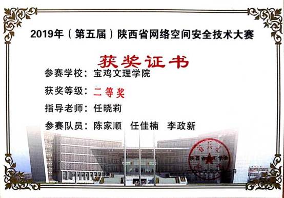 日前,2019年第五届陕西省网络空间安全技术大赛在西安工业大学未央校区落下帷幕。开元由计算机学院教师任晓莉指导,2018级软件工程专业陈家顺、2017级软件工程专业任佳楠、2015级软件工程专业李政新组成的“长亭外XnyL”代表队参加比赛,经过六个小时的激烈角逐,获得了二等奖。