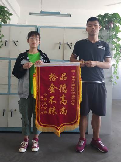 6月10日10时左右,2018级计算机科学与技术专业的冯佳鑫同学从陈仓大道底店路口下车后,准备前往驾校练车。当他经过路口的绿化带时,发现前方有个黑色物品,走近一看是个手提背包,打开后里面有银行卡、高考准考证和人民币若干元等重要物品。冯佳鑫同学当时看到周围无人,他就一边在原地等候,一边打听过往的行人,积极设法寻找失主。在一时找不到失主的情况下,他首先借助微信朋友圈、微博发布“失物招领”,同时准备去派出所报备。功夫不负有心人,在原地等候两个多小时后,终于联系到了失主,在核对无误后,他将手提背包原封不动地如实还给了心急如火的失主。失主小张看到自己丢失的贵重物品失而复得,激动得喜出望外,对他拾金不昧的高尚行为大加赞赏,特制作一面锦旗表示感谢。于是,就出现了文章开头的那一幕。