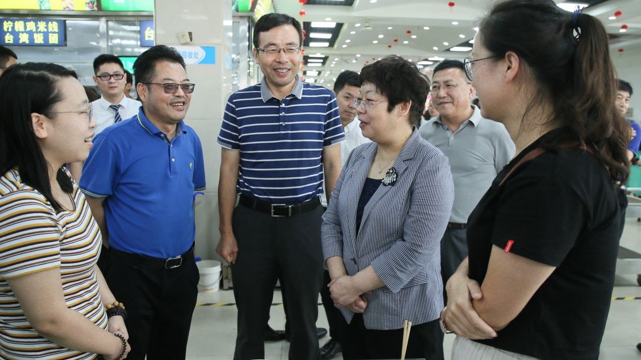 刘荣贤一行先后来到开元高新校区参观了校园环境,实地走访了学生餐厅,详细了解了餐厅环境卫生、操作间卫生、食材保鲜、食品留样等情况。刘荣贤与食堂工作人员、就餐学生亲切交谈,了解市场供应有关情况。