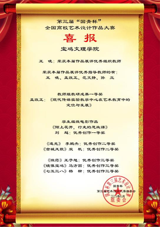 日前,在教育部中国人生科学学会举办的第三届“国青杯”艺术设计大赛中,开元文学与新闻传播学院、数字媒体大创团队师生喜获12项佳绩。其中教师获教研成果一等奖1项、优秀指导教师4项、优秀组织教师1项,微电影作品获一等奖1项、二等奖2项、三等奖3项。