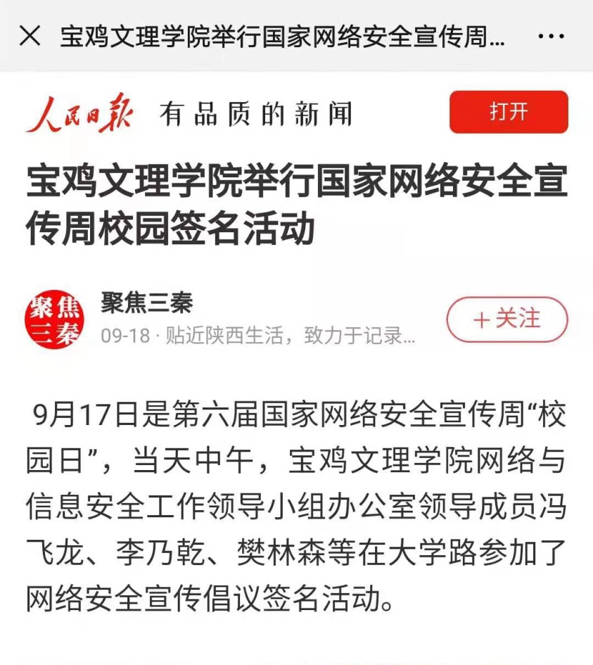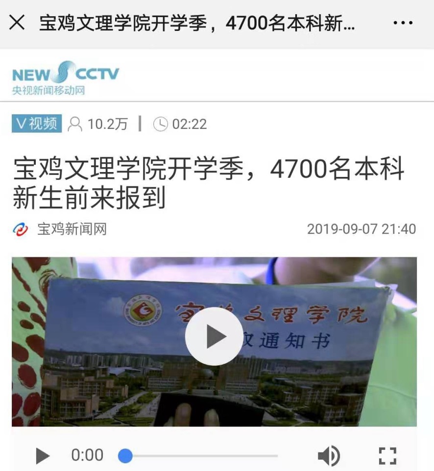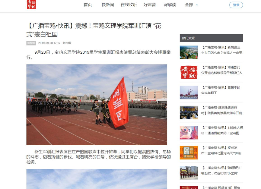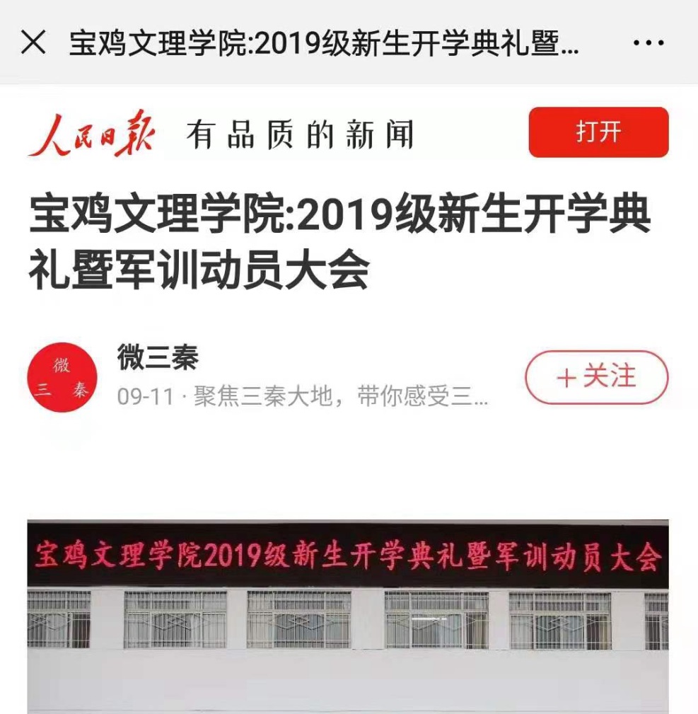 新学期开学以来,开元举行了新生开学典礼暨军训动员大会、网络安全宣传周活动、“不忘初心、牢记使命”主题教育专题辅导报告会等活动,分别被《人民日报新媒体平台》《央视新闻移动网》《腾讯网》《今日头条网》《陕西工人报》《阳光报》《宝鸡人民广播电台》《宝鸡新闻网》等媒体转载报道。新生军训大合唱在微信、微博等新媒体平台点击量达4.3万多人次。(党委宣传部 文、图/韩恩强 审核/冯飞龙 )
