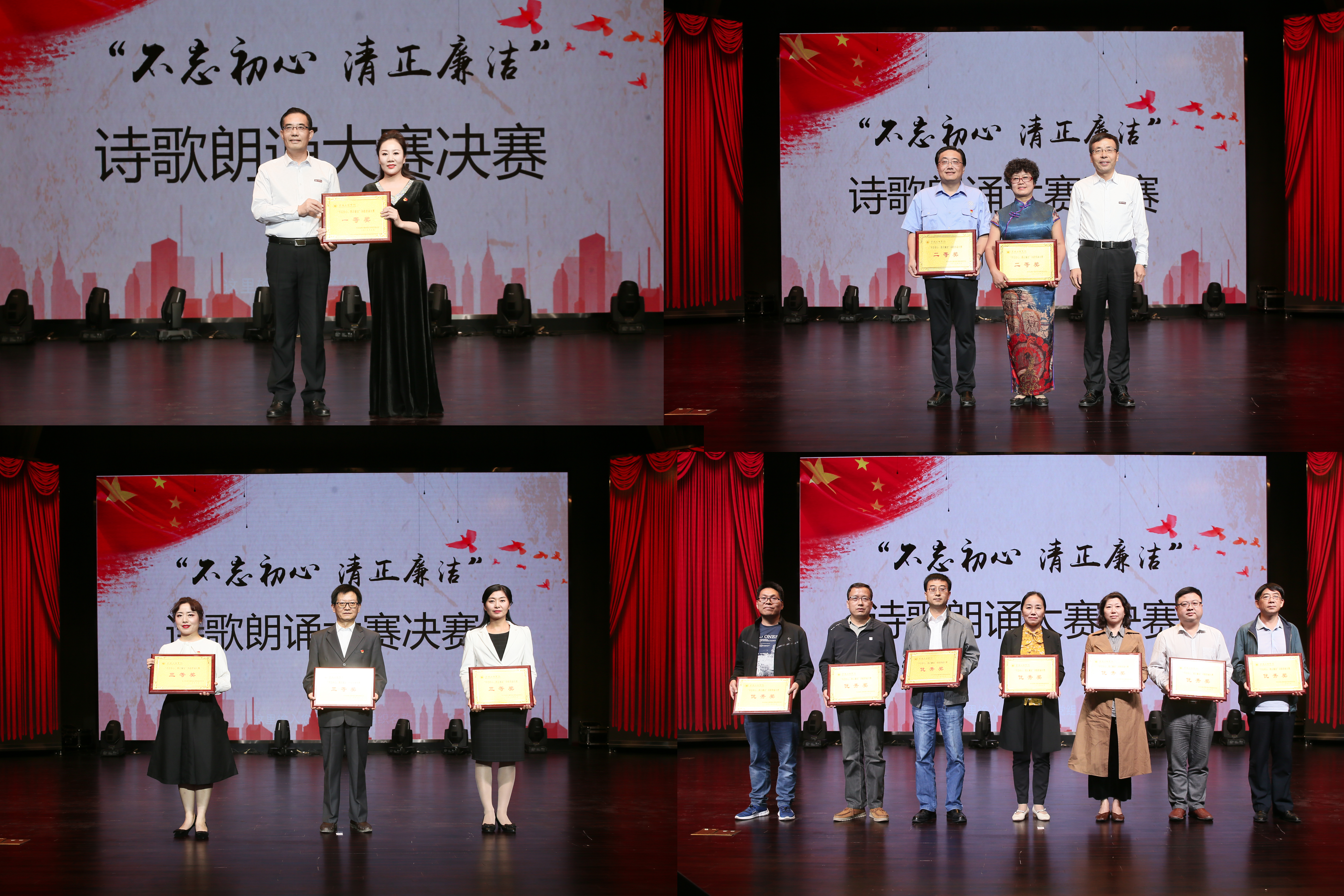最终,音乐学院党总支获得本次诗歌朗诵大赛一等奖,地理与环境学院党委、后勤管理处(后勤集团)党总支获得二等奖,文学与新闻传播学院党委、图书馆党总支、物理与光电技术学院党委获得三等奖,机关党群党总支等7个党委(党总支)获得优秀奖。校领导为获奖单位颁发了奖牌。诗歌朗诵大赛在决赛现场观众及全体参赛队员手持国旗、同唱《我和我的祖国》的歌声中落下帷幕。(校纪委 文/王瑾 图/张平 审核/唐晓育)