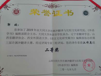 本次大赛由山西大同大学许渊冲翻译与比较文化研究院、《外语学刊》编辑部联合主办,辽宁省翻译学会、西安外国语大学、《语言文化研究》编辑部协办,旨在研究和践行许渊冲先生的翻译理念,推动翻译学科发展及中外文化交流。 来自全国31个省、自治区、直辖市和英国、加拿大等401所高等院校、研究院所、中学、公司及企事业单位参赛,分别决出“英译汉组”和“汉译英组”一等奖1名,二等奖2名,三等奖3名。(教务处、外国语学院 文、图/王怡 审核/田延锋、王卫强)