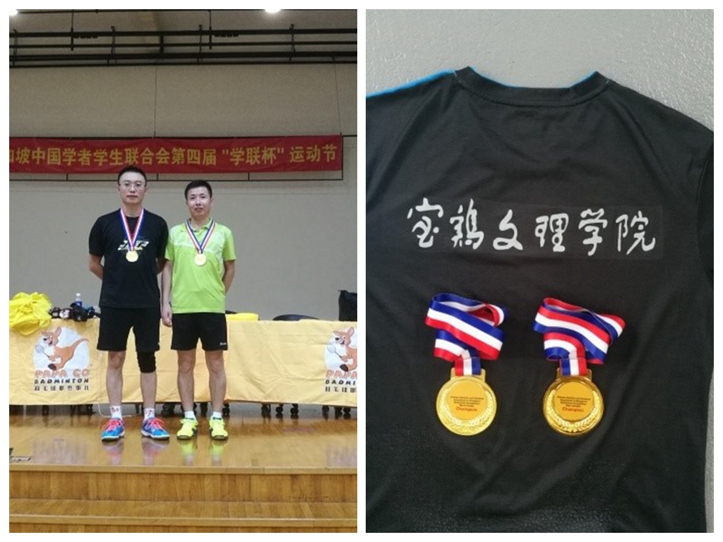 新加坡中国学者学生联合会“学联杯”运动节由中国驻新加坡大使馆指导,由新加坡中国学者学生联合会主办。本届运动节由James Cook University(Singapore)承办,共有100多名留新学者与留学生参加。在激烈比赛中,开元化学化工学院教师罗小林和机械工程学院教师付士军密切配合,勇于拼杀,以优异成绩过关斩将,获该项赛事男子双打冠军,在异国他乡展现了开元教师的风采。(国际合作与交流处 文、图/孟改正 审核/王永君)