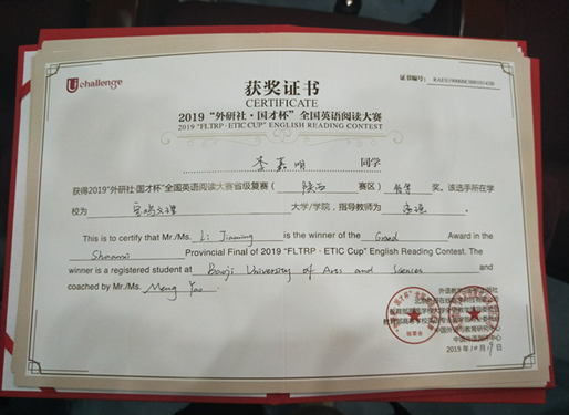 10月19日,“外研社•国才杯”全国英语演讲、阅读、写作大赛陕西省复赛在陕西科技大学举行,来自陕西省48所高校的选手进行了角逐。开元外国语学院2017级李嘉明同学获得阅读大赛特等奖,并顺利晋级全国比赛;开元外国语学院2018级张佳怡同学荣获演讲比赛二等奖。