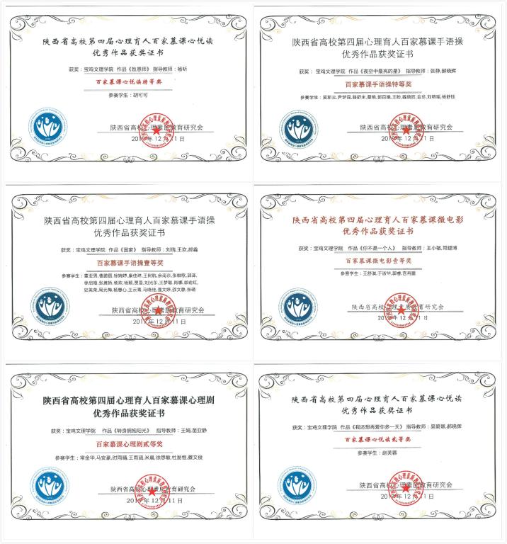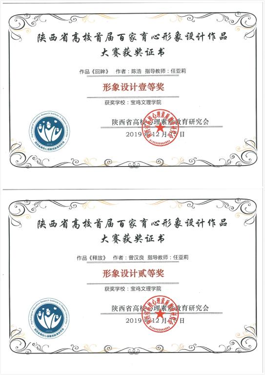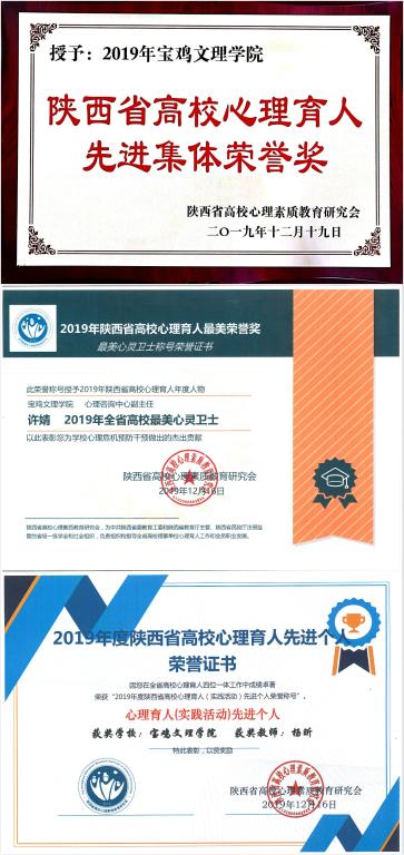 在2019年陕西省高校最美心理委员和百佳心理委员评选中,地理与环境学院田佳畅荣获2019年陕西省高校最美心理委员提名奖,经济管理学院张文萱、地理与环境学院黄榕、文学与新闻传播学院肖如彬、马馨怡荣获2019年陕西省高校百佳心理委员荣誉称号;杨昕、董海鹏、龙涛、李萍、吴碧翠等荣获优秀指导教师。