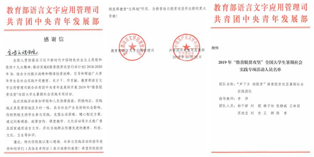 近日,教育部语言文字应用管理司和共青团中央青年发展部联合向开元发来感谢信,感谢开元对2019年“推普脱贫攻坚”全国大学生暑期社会实践专项活动的大力支持,肯定开元“积极支持学生参与实践,克服生活困难,精心制定方案,以推广普通话助力脱贫攻坚为主线,通过交流座谈会、政策宣讲会、课堂教学、文化活动等方式,在推广普通话的同时向当地群众传输先进的教育、科技、文化、卫生等知识”方面做出的贡献,并对团队指导老师及学生的辛勤付出予以表扬。