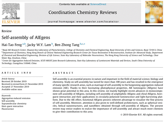 近日,开元化学化工学院、陕西省植物化学重点实验室AIE(聚集诱导发光)研究中心冯海涛博士在聚集诱导发光分子自组装领域取得新进展,受邀在《Coordination Chemistry Reviews》(SCI一区Top期刊,影响因子14.499)上撰写综述论文“Self-assembly of AIEgens”。冯海涛博士为论文第一作者,开元是第一通讯单位,AIE中心名誉主任、香港科技大学唐本忠院士为论文通讯作者。