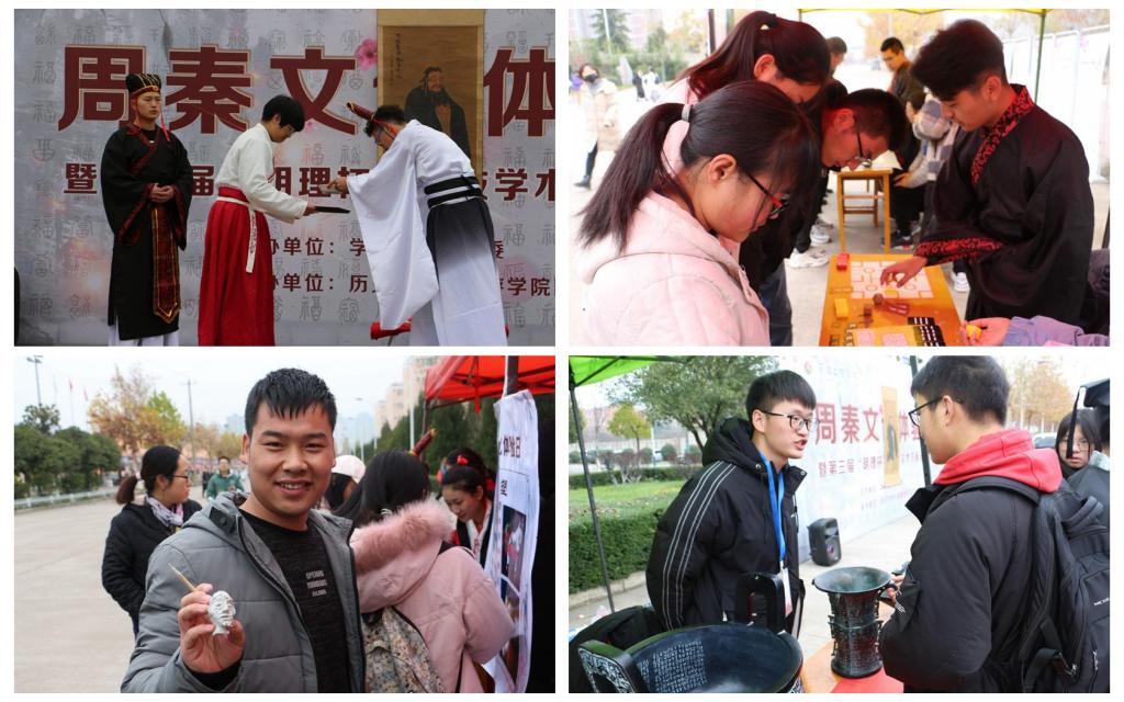 本次活动由学工部、校团委主办,历史文化与旅游学院团总支承办,也是校第三届“明理杯”科技学术节展示活动之一。现场活动有周秦文化与习近平总书记用典宣传,中国青铜器博物院“国宝”展示,还有学生自编自演的《拜师礼》和汉服表演、《诗经》诵读等小舞台剧演出,同时现场设置了书写小篆、制作青铜器拓片、手工制作陶泥、学下六博棋,学做汉服和现场知识竞答等体验活动,吸引了众多学子驻足观看和积极参与。