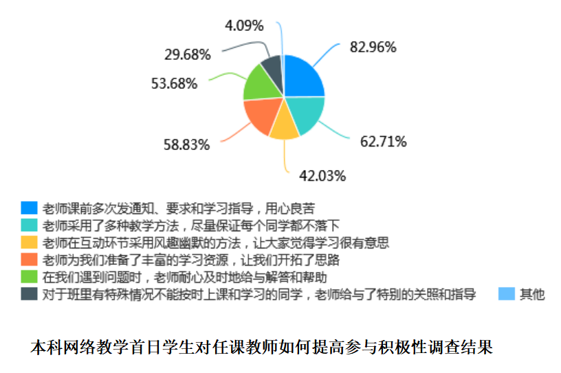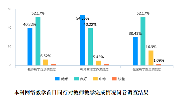 五是加强督查,保证线上教学效果。通过学校网站、QQ群、微信群、微信公众号等方式,安排相关工作任务,加强教学过程管理,交流网络教学心得体会,督促教师提前准备网络教学材料、选择适合的线上教学方式、留存教学记录与资料。设计了线上教学同行、教师、学生问卷调查,分析并反馈了问卷调查结果。执行二级学院领导值周检查教学纪律和管理干部在线检查教学纪律制度,及时通报检查结果。征求了学生信息员意见建议,反馈了有关情况,督促相关单位整改落实。网络教学第一周,校级教学督导在线深入二级学院,了解了线上教学安排和督导工作,探讨了新形势下教学质量监控与评估工作,为后续工作做好了准备。