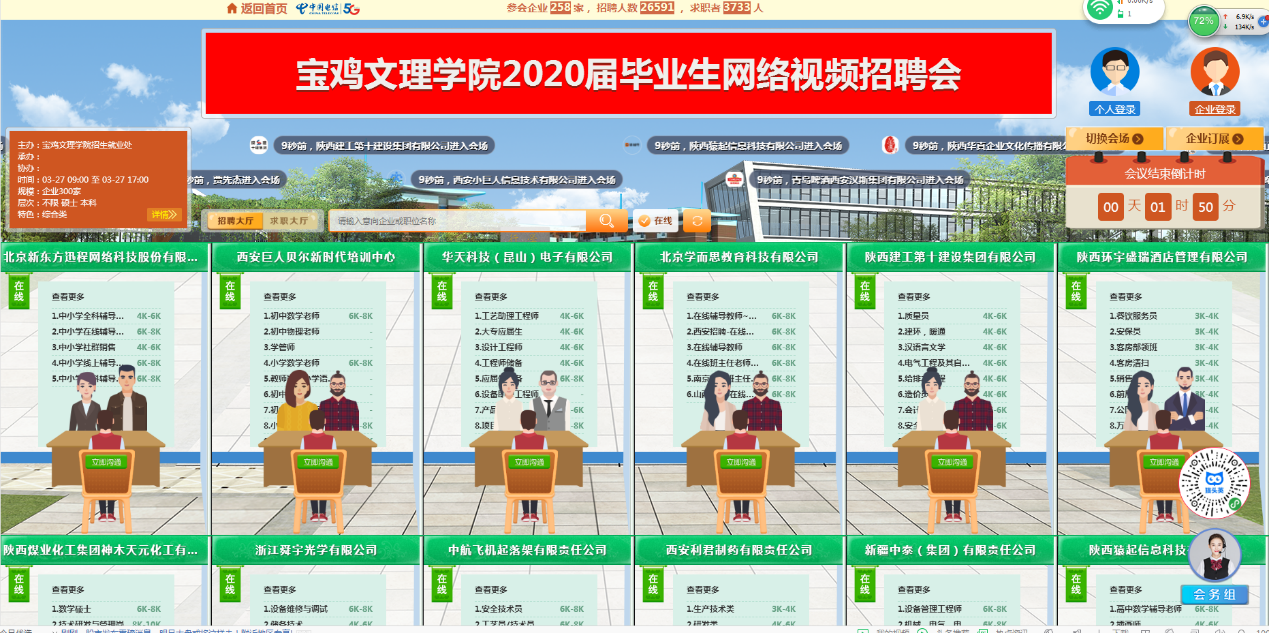 本次网络视频招聘会引起了各用人单位和毕业生的广泛关注,据统计,共有来自北京、河北、山东、江苏、安徽、上海、浙江、广东、四川和陕西等全国多个省(市)的258家企业参会,提供岗位1328个,需求人数26593人。3754名来自省内多所高校的毕业生参会,其中开元学生2999人,投递简历7453人次。