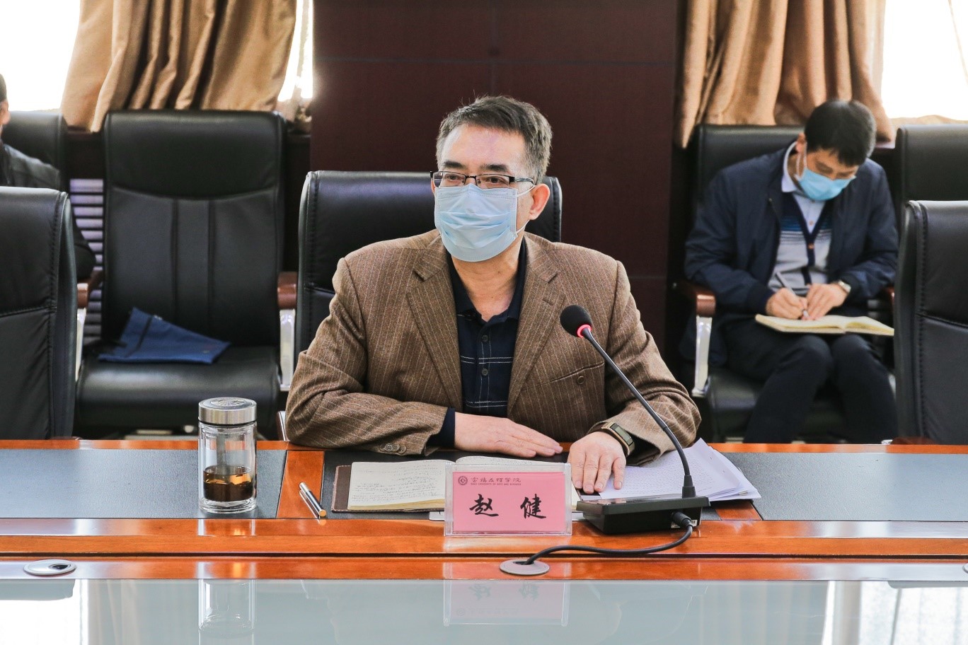 视频会议结束后,赵健主持召开了学校脱贫攻坚暨春季开学工作部署会,党政办公室主任(扶贫办公室主任)任红亮汇报了2020年扶贫工作开展情况,学生处处长冯森汇报了本科生错时返校方案及返校后防控工作预案,学科建设与研究生教育管理处处长赵天绪汇报了研究生开学准备工作、毕业生论文答辩和学位授予工作预案,附属学校校长张伟建汇报了中学开学准备工作。