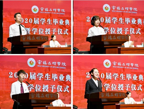 毕业典礼在庄严的国歌声中拉开序幕。郭霄鹏以《勇担时代责任 谱写青春之歌》为题发表了热情洋溢的致辞。他代表学校向2020届圆满完成学业、即将踏上人生新征程的全体毕业生表示热烈的祝贺。他表示,今年的相聚方式有些特别,虽然没有数千人在体育场的欢聚,但学校对同学们的牵挂之心、祝福之情丝毫未减。他说,过去的几年里,2020届毕业生从求知少年成长为有志青年、从稚嫩走向成熟、由懵懂变得沉稳,成为了具有宝文理精神特质的优秀人才,他们一直努力践行着宝文理精神,续写着宝文理新的华章。他们的努力、汗水和成绩,为宝文理增添了无限光彩,为学校争得了荣誉,全校教职工为他们点赞!