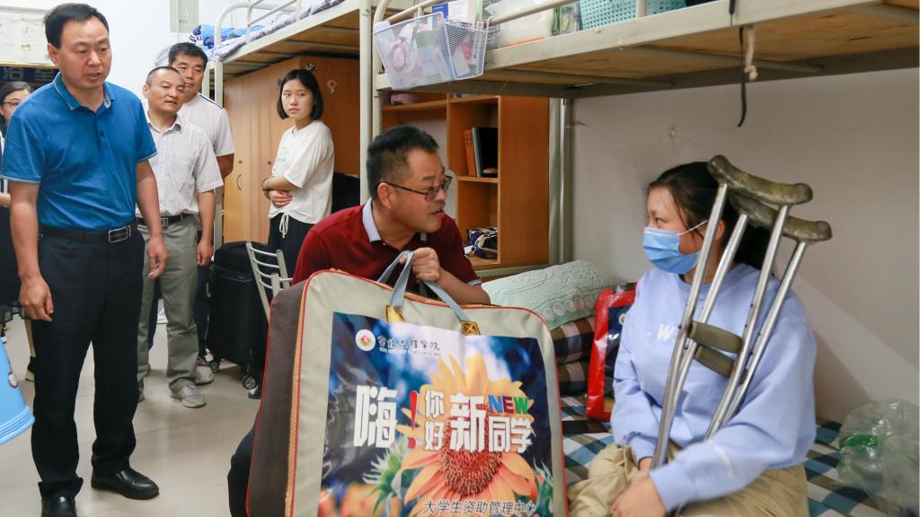 新生报到第二天,校党委副书记栾宏对新生绿色通道工作进行了检查指导,为四名家庭经济困难新生发放了“爱心大礼包”,并与学生亲切交谈,勉励学生要自强不息、刻苦学习,力争以优异的学习成绩回报亲人、学校和社会,做一个对国家有贡献的人。