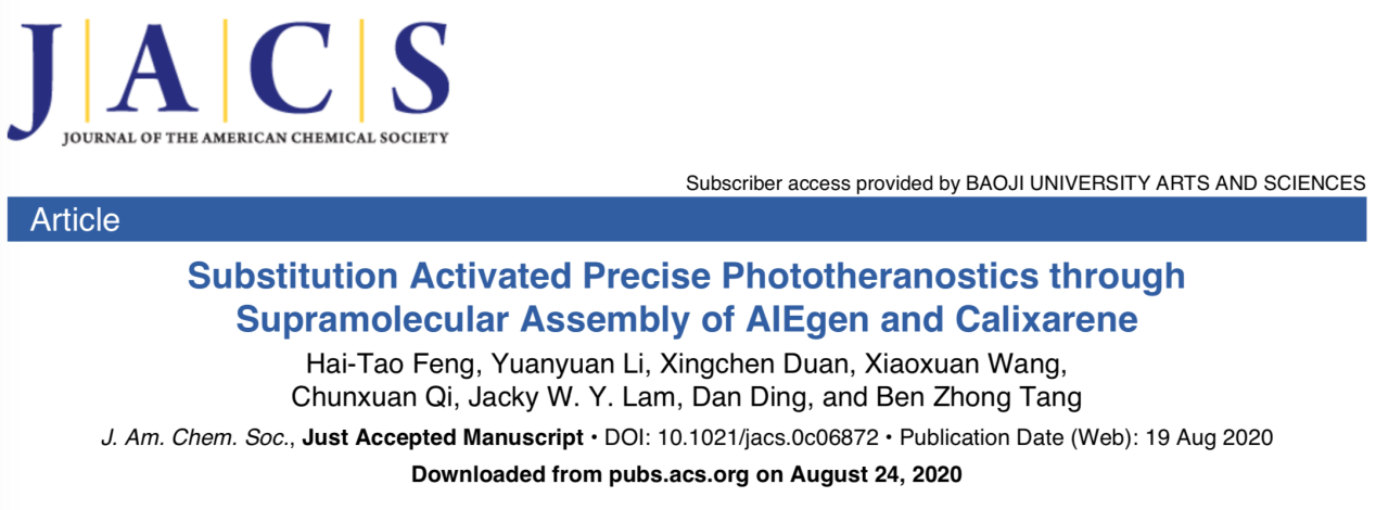 开元AIE(聚集诱导发光)研究中心、陕西省植物化学重点实验室、化学化工学院冯海涛博士时隔三个月,继Nature子刊Nature Communications和Journal of the American Chemical Society(简称JACS)之后,又在国际顶级期刊JACS上发表题为“Substitution Activated Precise Phototheranostics through Supramolecular Assembly of AIEgen and Calixarene”的学术论文。论文第一作者和通讯作者为冯海涛博士,开元是第一通讯及署名单位,南开大学丁丹教授和开元AIE研究中心名誉主任、香港科技大学唐本忠院士为论文共同通讯作者。