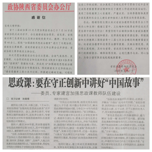 4月中旬,收到省政协办公厅关于征集省政协“加强高校思想政治教育”月度协商座谈会发言稿件的通知后,校党委高度重视,党委统战部积极协调选派专家准备征集稿件。在统战部的积极协调下,王富平教授、康江峰教授、王红梅教授和刘晓勇副教授接受了意见征集任务,在进行广泛调研后,积极撰写了发言稿件。7月16日,王富平撰写的《落实“三全育人”理念,形成育人合力,切实增强思政教育实效》、王红梅撰写的《新时代高校思政课教师要坚持“四真”与“四有”》、刘晓勇撰写的《高校思政课教师队伍建设需处理好三对基本矛盾》在省政协组织的月度协商座谈会上进行了书面交流。省政协机关报《各界导报》在7月21日刊发通讯稿《思政课:要在守正创新中讲好“中国故事”》,重点推介了刘晓勇的意见和建议。