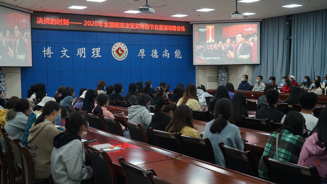 10月17日晚8时,学校扶贫办组织师生收看了《决战的时刻——2020年全国脱贫攻坚奖特别节目》,学校扶贫工作领导小组成员、学生和教职工通过电视、手机等多种渠道收听收看。