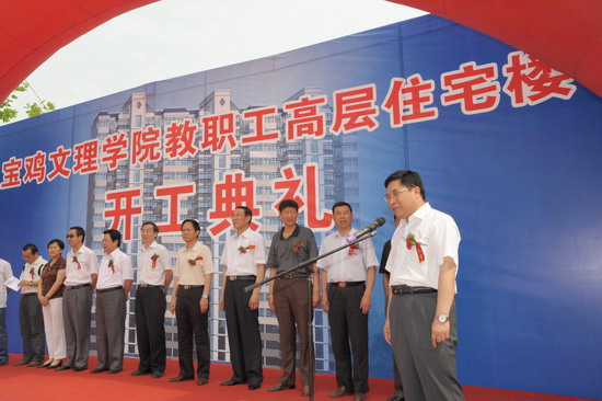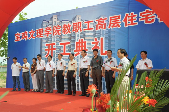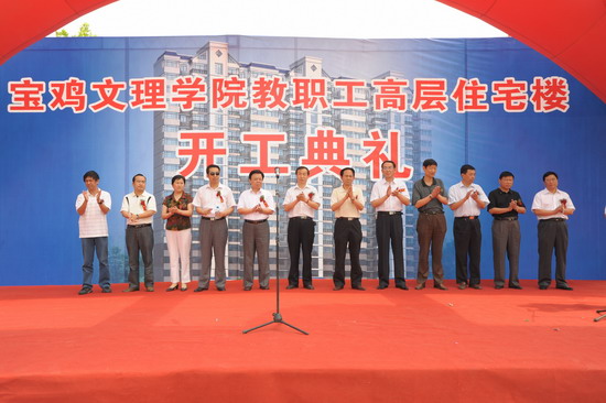 7月4日上午,学院在新校区建设工地举行教职工高层住宅楼开工典礼。院党委书记赵怀礼,院长王志刚,院党委副书记米晓东、李全武,副院长傅志军、王普藩、赵荣侠,宝鸡市相关部门领导,代建单位陕西华盛实业有限公司和承建单位通州建总集团公司领导等出席开工典礼。典礼由基建处处长刘宗杰主持。