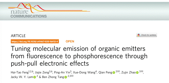其中,研究论文“Tuning molecular emission of organic emitters from fluorescence to phosphorescence through push-pull electronic effects”发表在Nature子刊Nature Communications(SCI一区Top期刊,影响因子12.18)上,论文第一作者为冯海涛博士,开元是第一通讯单位,开元AIE中心名誉主任、香港科技大学唐本忠院士为论文通讯作者,这也是开元第一次以第一单位在高水平Nature子刊上发表学术论文。