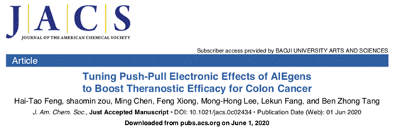 研究论文“Tuning Push-Pull Electronic Effects of AIEgens to Boost Theranostic Efficacy for Colon Cancer”发表在化学领域顶尖期刊Journal of the American Chemical Society(简称JACS,SCI一区Top期刊,影响因子14.69)上,开元是第一通讯单位,唐本忠院士为论文通讯作者,这也是开元第一次以第一单位在如此高水平期刊上发表学术论文。JACS杂志中文名称为《美国化学会志》,1879年由美国化学会创办,至今有141年历史。谷歌学术将所有学科分为八大领域,JACS位列化学与材料科学领域第一。