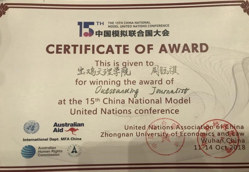 10月11日至14日,由中国联合国协会主办的第十五届中国模拟联合国大会在中南财经政法大学举行,来自北京大学、国防科技大学等全国近200所知名高校的500余名师生参加了大会,联合国秘书长古特雷斯先生专门为大会发来致辞视频。开元文学与新闻传播学院2016级校学生模拟联合国协会负责人王东宇受邀参会,外国语学院2015级学生周钰祺参加大赛荣获大会“杰出记者奖”。本次模联大会首次以全英文形式作为本次会议的交流语言,开元学生在场上以清晰的思维,切实的政策主张及精准的表达,赢得了大会主席和评委的一致认可和高度赞扬。