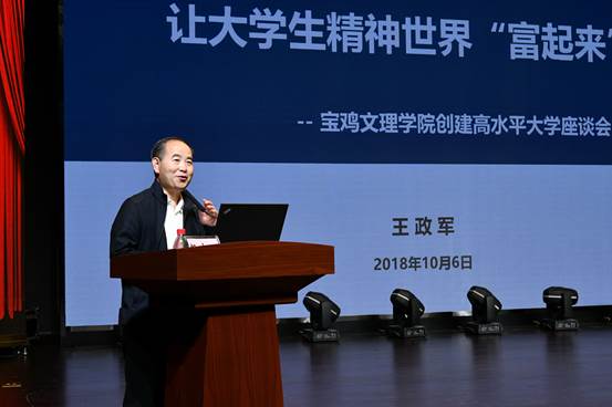 陕西汉江药业集团董事长王政军作了题为《让大学生精神世界“富起来”》的报告。他提出大学是人生性命之道的双修地,指出精神迷失是当前大学生存在的重要问题,并建议要重视培养大学生的健康意识、健康能力、道德底线思维等,培养健康有用的社会主义事业接班人。