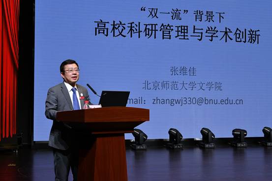 北京师范大学文学院教授、语言学与应用语言学研究所所长、北京市语委研究基地北京语言文化研究中心主任张维佳作了题为《“双一流”背景下的高校科研管理与学术创新》的报告。他介绍了“双一流”的学术标准,并对科研管理与学术研究中存在的五大悖论之“瓶颈”问题进行分析,提出了推进科研管理科学化与学术创新的建议。
