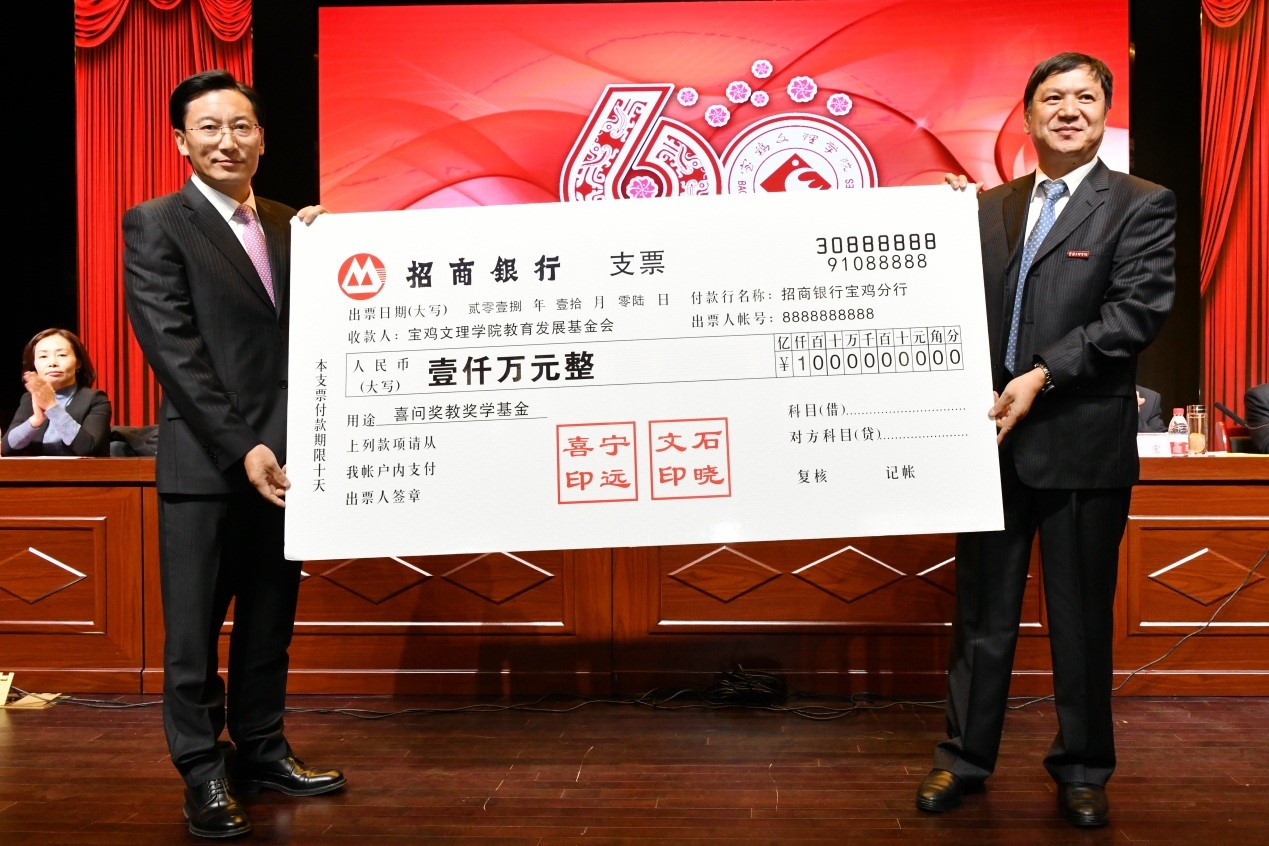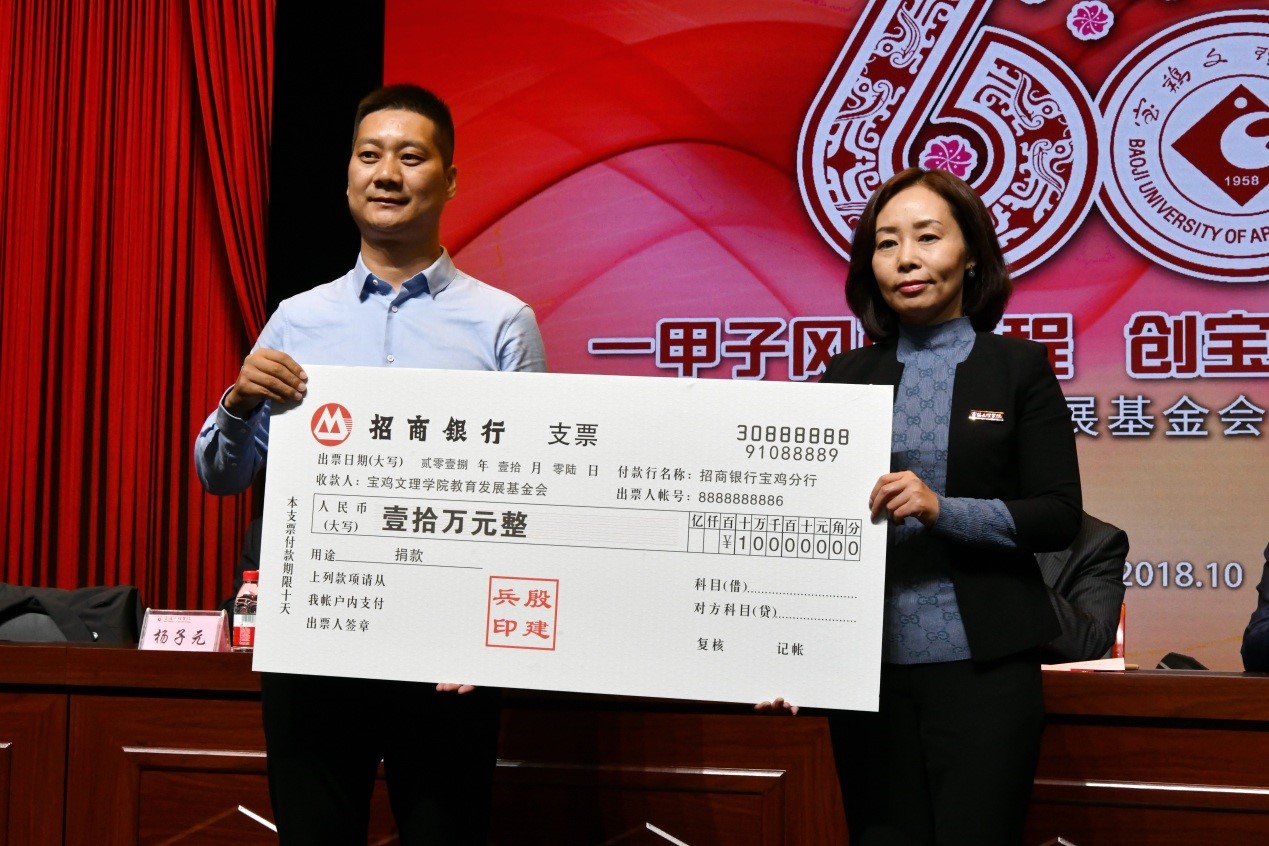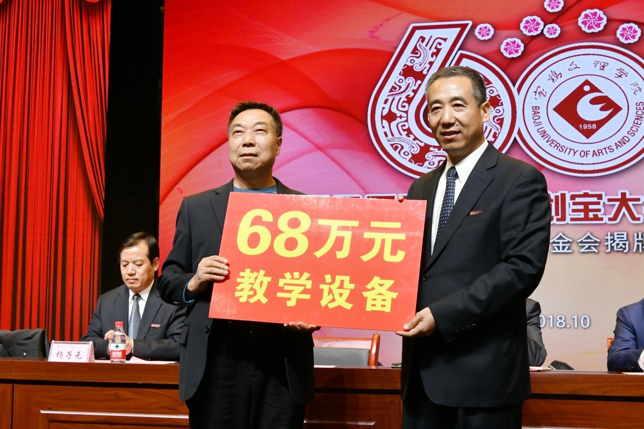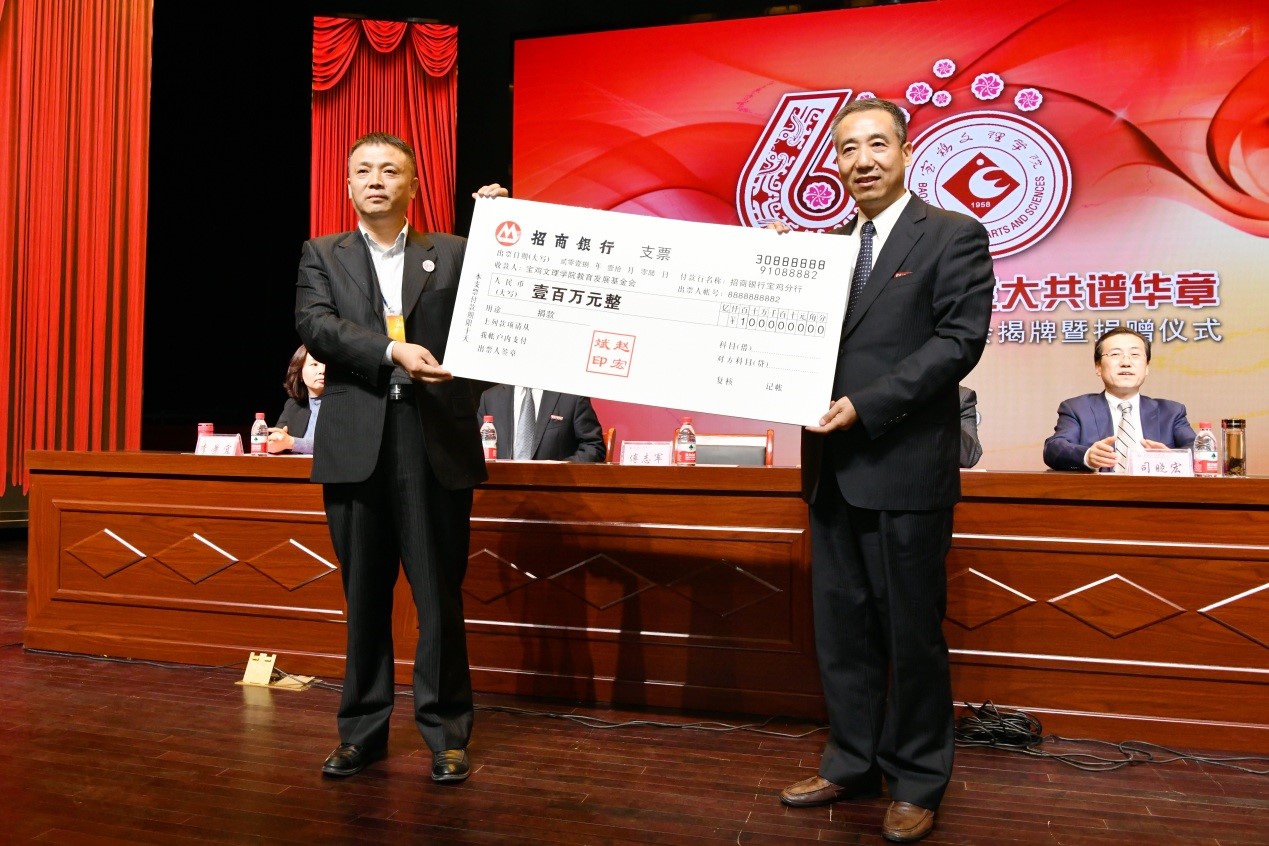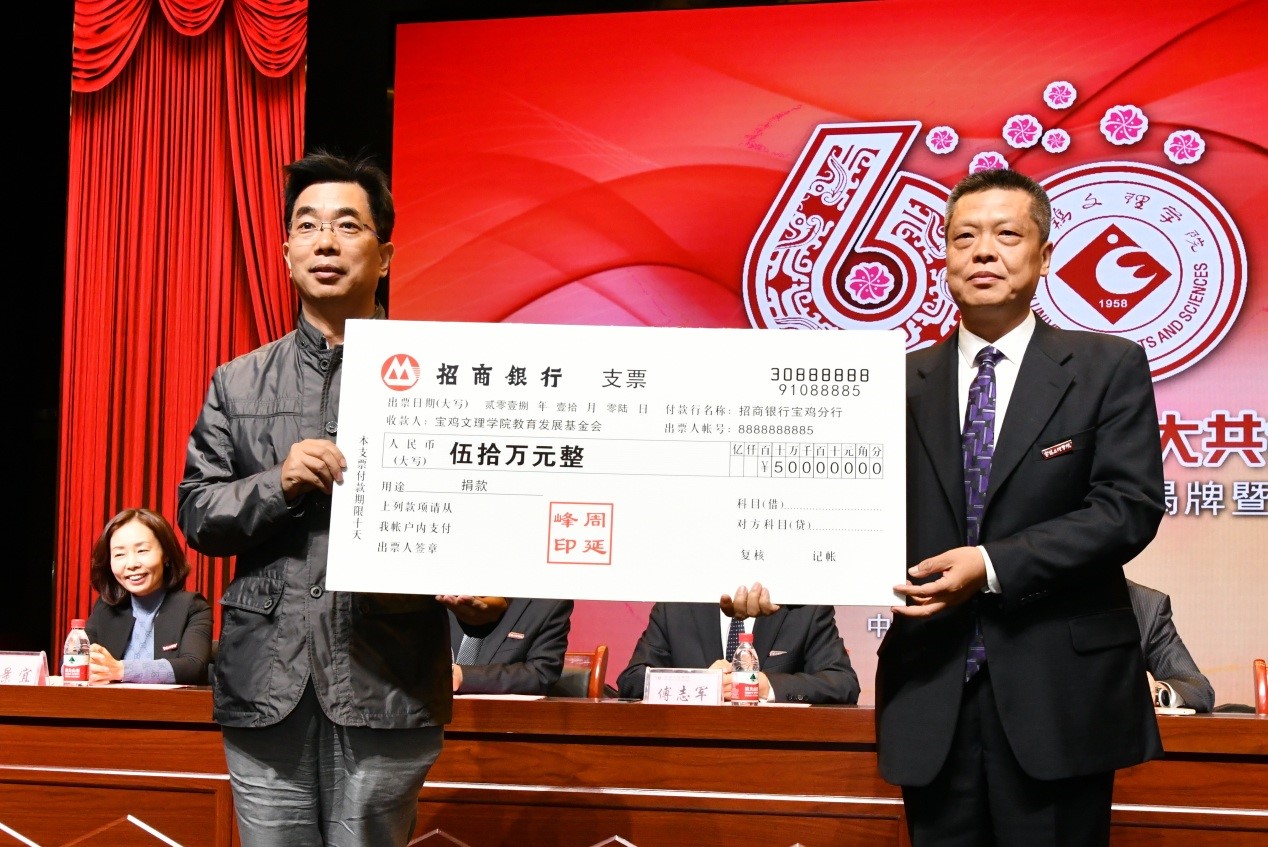 捐赠仪式上,数学与信息科学学院90级校友宁远喜向母校捐赠1000万元;文学与新闻传播学院84级校友、陕西联兴房地产开发公司董事长徐洲成,经济管理学院93级校友、上海经纬建筑规划研究院宁波分院院长赵宏斌分别向母校捐赠100万元;经济管理学院93级校友、陕西欧艺高商贸有限公司董事长王晓东,经济管理学院93级校友、西安博宇节能环保科技有限公司董事长杨旺团,政法学院92级校友、浙江博方律师事务所主任周延峰分别向母校捐赠50万元;北京校友分会副会长、西安和而不同文化产业发展有限公司董事长王丰向学校捐赠33.9万元;外国语学院92级校友、宁波太阳湖工艺品公司总经理魏垂亭,物理与光电技术学院03级校友、宝鸡英创教育董事长殷建兵分别向母校捐赠10万元;在开元工作36年的退休职工杨别科捐赠价值68万元教学设备;歌山集团总经理王志华捐款5万元;宝鸡正徽酒业营销策划有限公司总经理吴永利为学校捐赠了价值6万余元的物资;美术学院96级校友、山东校友分会会长王治国,体育学院98级校友、陕西亚华环境工程有限公司总经理付斌林,宝鸡市汉唐图书有限责任公司刘建华,青岛啤酒汉斯宝鸡有限公司党委书记、董事长兼总经理孔锁贤,西安厚朴餐饮管理有限公司金有民也慷慨解囊,为学校捐赠。