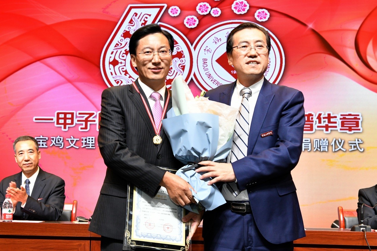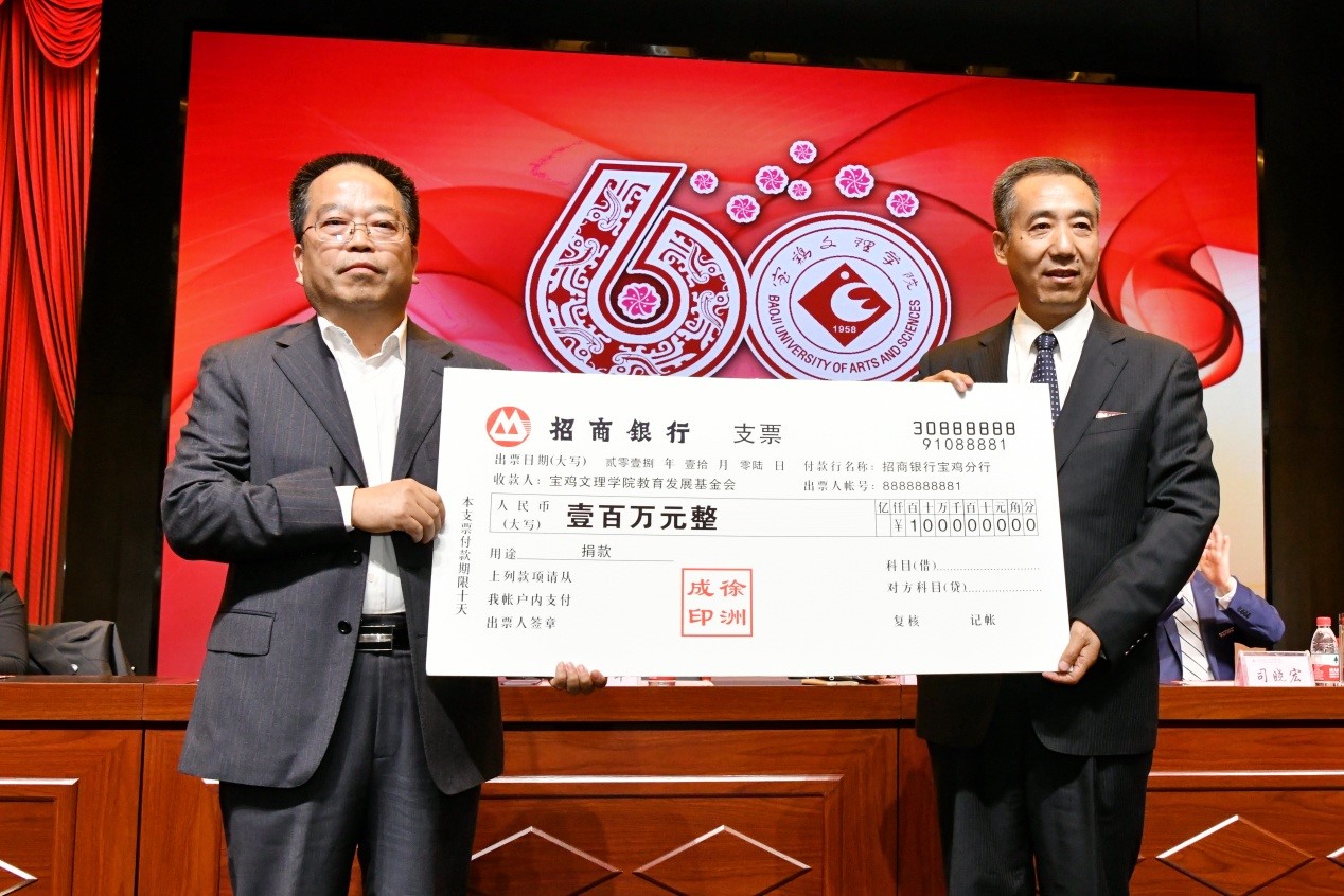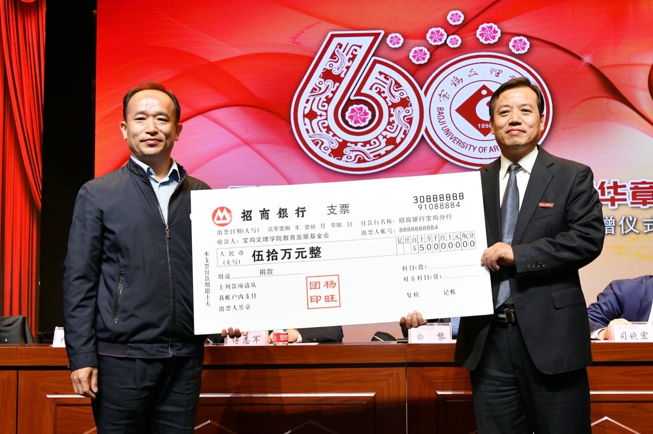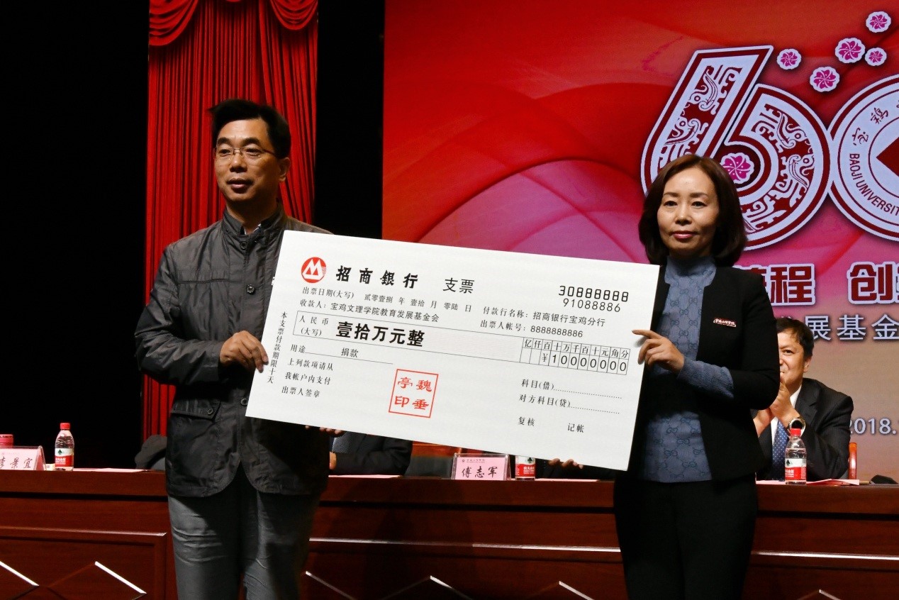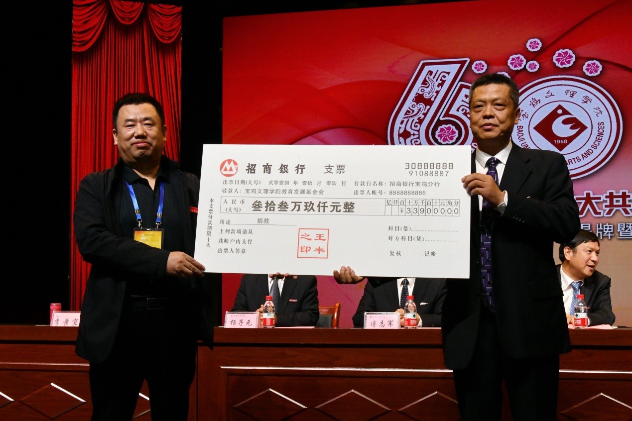 捐赠仪式上,数学与信息科学学院90级校友宁远喜向母校捐赠1000万元;文学与新闻传播学院84级校友、陕西联兴房地产开发公司董事长徐洲成,经济管理学院93级校友、上海经纬建筑规划研究院宁波分院院长赵宏斌分别向母校捐赠100万元;经济管理学院93级校友、陕西欧艺高商贸有限公司董事长王晓东,经济管理学院93级校友、西安博宇节能环保科技有限公司董事长杨旺团,政法学院92级校友、浙江博方律师事务所主任周延峰分别向母校捐赠50万元;北京校友分会副会长、西安和而不同文化产业发展有限公司董事长王丰向学校捐赠33.9万元;外国语学院92级校友、宁波太阳湖工艺品公司总经理魏垂亭,物理与光电技术学院03级校友、宝鸡英创教育董事长殷建兵分别向母校捐赠10万元;在开元工作36年的退休职工杨别科捐赠价值68万元教学设备;歌山集团总经理王志华捐款5万元;宝鸡正徽酒业营销策划有限公司总经理吴永利为学校捐赠了价值6万余元的物资;美术学院96级校友、山东校友分会会长王治国,体育学院98级校友、陕西亚华环境工程有限公司总经理付斌林,宝鸡市汉唐图书有限责任公司刘建华,青岛啤酒汉斯宝鸡有限公司党委书记、董事长兼总经理孔锁贤,西安厚朴餐饮管理有限公司金有民也慷慨解囊,为学校捐赠。