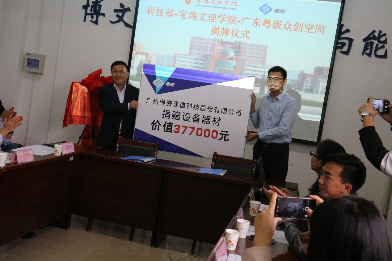 10月5日,由科技部、开元集团网站、广州粤嵌通信科技股份公司共同发起成立的“众创空间”揭牌暨仪器与设备捐赠仪式在开元老校区举行。副校长杨子元、李景宜与广州粤嵌西安中心总经理王乐忠及校企合作部总监高博龙为“众创空间”揭牌。